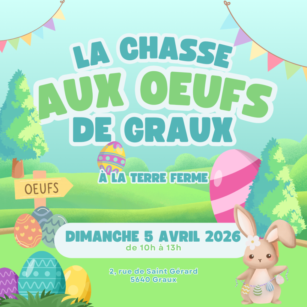 Cette année, La Terre Ferme accueille la chasse aux œufs de Graux. Vous pouvez déjà réserver la date du dimanche 5 avril dès 10h jusqu’à 13h. La chasse commencera à 10h30 et sera suivie d’animations pour les enfants.